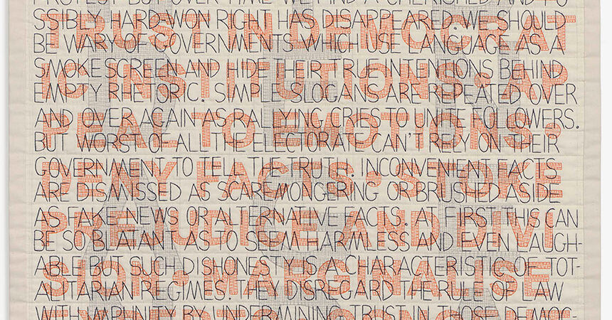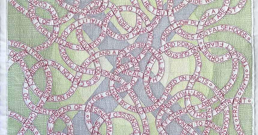 Sara Impey is a British quilt artist specialising in machine-stitched lettering. Her book ‘Text in Textile Art’ is available on Amazon in the UK and USA.
